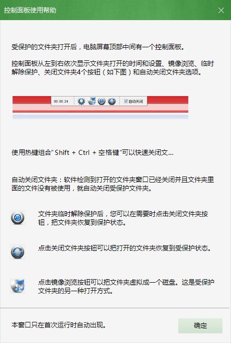 在第一次打開加密文件夾時(shí),軟件會(huì)彈出控制面板的幫助說明窗口。